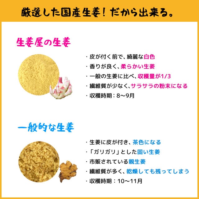 石臼の機械で粉砕することで、素材の水分が飛びにくく生姜本来の「色・香り・辛味」をお楽しみいただけます。